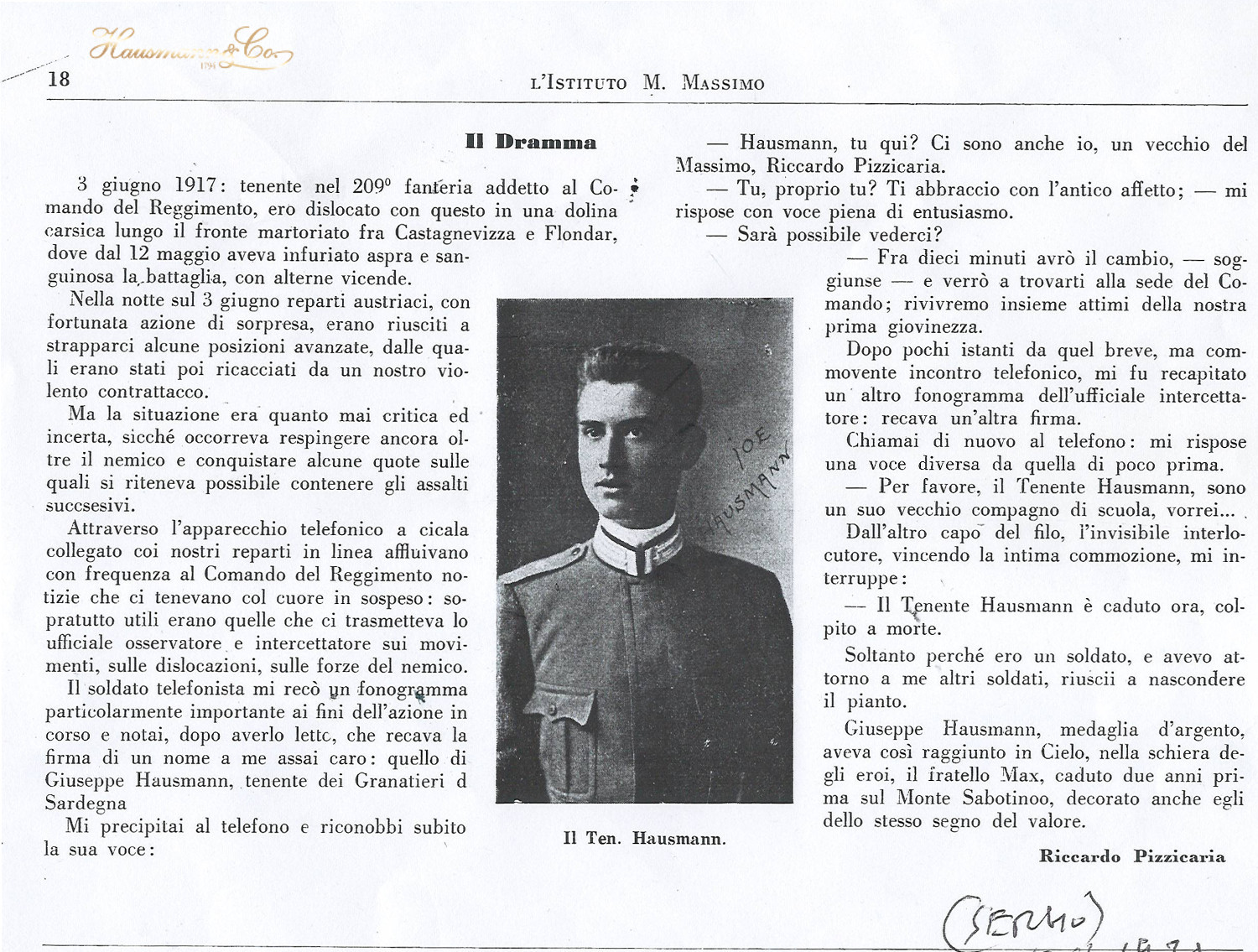 Con voce commossa, Sergio ci ha mostrato la copia di questo articolo scritto alla fine della Prima Guerra Mondiale da suo padre per la rivista dell’Istituto Massimo, una delle scuole di eccellenza a Roma: era il ricordo di Joseph Hausmann, caduto nel 1917, ormai 98 anni fa.