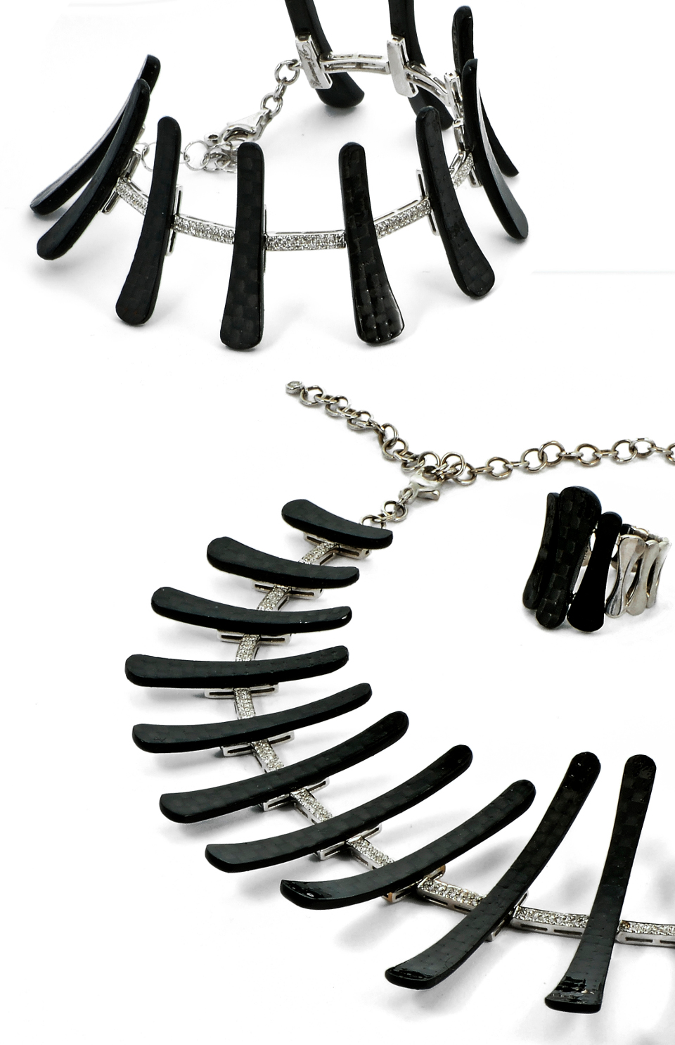 Italian hand made jewels with a modern style: Hausmann & Co. introduces an innovative use of the carbon fibre in jewelry. The HC1 collection includes sophisticated yet aggressive necklaces, bracelets and rings. Carbon fibre black elements are sustained by a gold ribbon with diamonds.