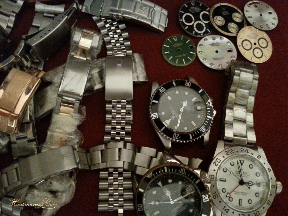 1. THE AESTHETIC: The external components of the watch seems to be the easiest to be evaluated at the moment of the purchase in order to avoid the fake watches risk. Indeed, replicas are quite easy to find for a watch expert, at least concerning the current productions. But a watch expert is not a watch lover: the latter can be confused by a good replica that seems fully original except for some features inconsistent with such reference (eg. an open back on a Rolex watch, a buckle without the right logo, etc.). It is important also to pay attention to the ability of used watches resellers to combine original components with fake ones: a beautiful and original Rolex dial, together with an original Rolex stainless-steel bracelet, even if made for a different reference and maybe coming from stolen watches, could fit apparently perfectly a fake case, giving to a watch without any value the look of a good deal. An example? It is sufficient to give a look at the picture below: many original pieces, even if in bad conditions, together with fake components, ready to be put together and sold.