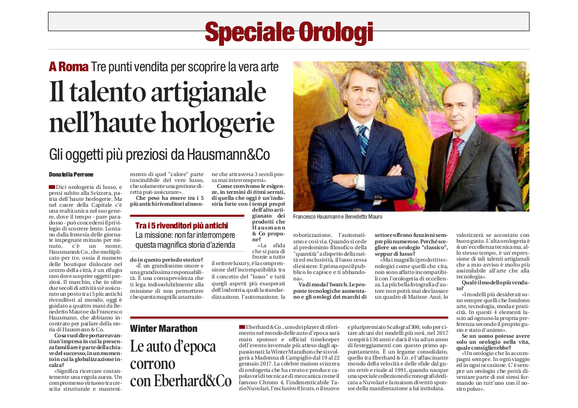 Francesco Hausmann, CEO of the Hausmann Group together with Benedetto Mauro, talks with “Il Tempo” about our Company, for an interview dedicated to the special watches issue.