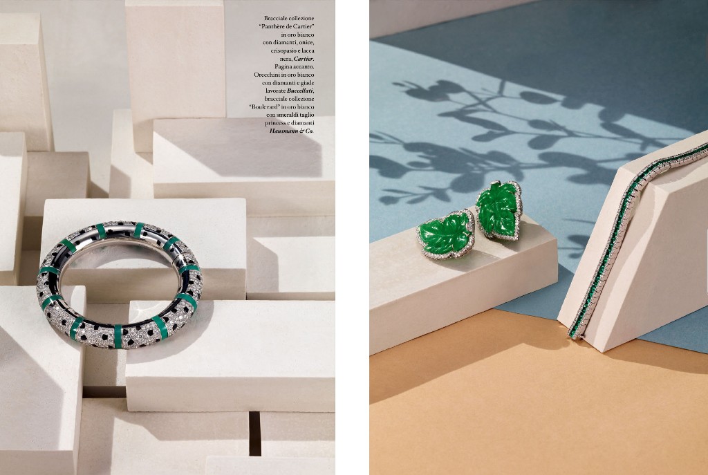 White gold “Boulevard” bracelet with diamonds and emeralds. From Hausmann & Co. Boulevard collection, presented by IoDonna, the feminine weekly newspaper from Corriere Della Sera, together with Cartier and Buccellati jewels.