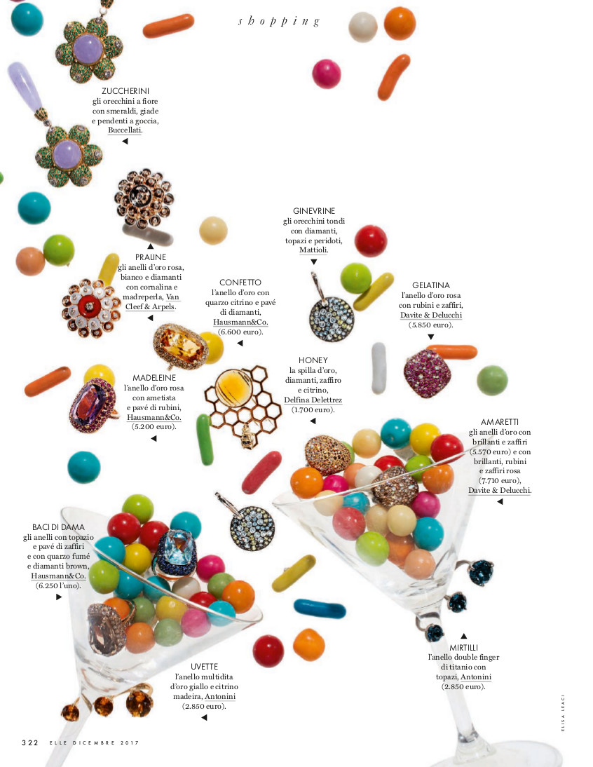 Elle created a colourful page with a selection of original and unconventional jewels. Among them, 4 rings from the Hausmann & Co. Maharaja collection, shown in the lower section of the page… and inside the cocktail glass!