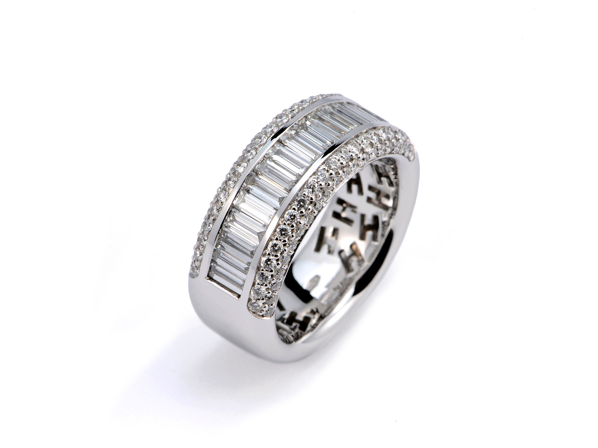 Band ring in white gold with half circle of baguette cut diamonds (ct. 1.35) and round brilliant cut diamonds (ct. 0.26).