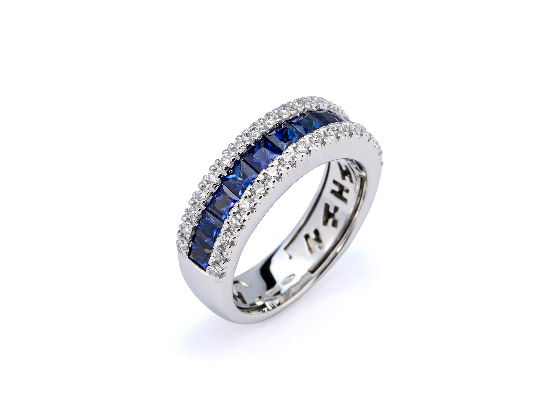 Band ring in white gold with half circle of princess cut sapphires (ct. 1.77) and round brilliant diamonds (ct. 040).