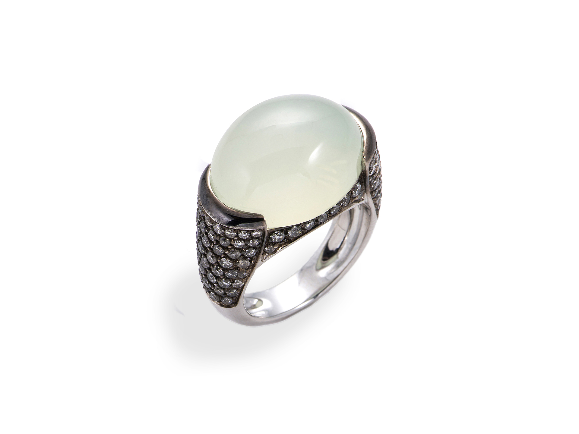 Ring in white gold with central green calcedony cabochon ( ct. 10.55 ) and grey diamond ( ct. 1.05 ) from Hausmann & Co. Cinque Terre Collection. Hand made in Italy.