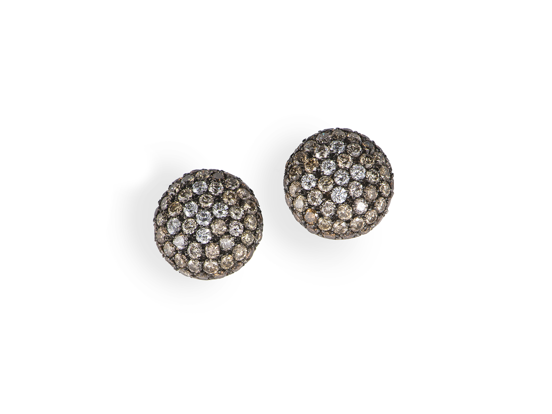 White gold flat round earrings with round brilliant cut diamonds in white (ct. 0,22) and brown (ct. 1,8) with colour shade stone setting.
