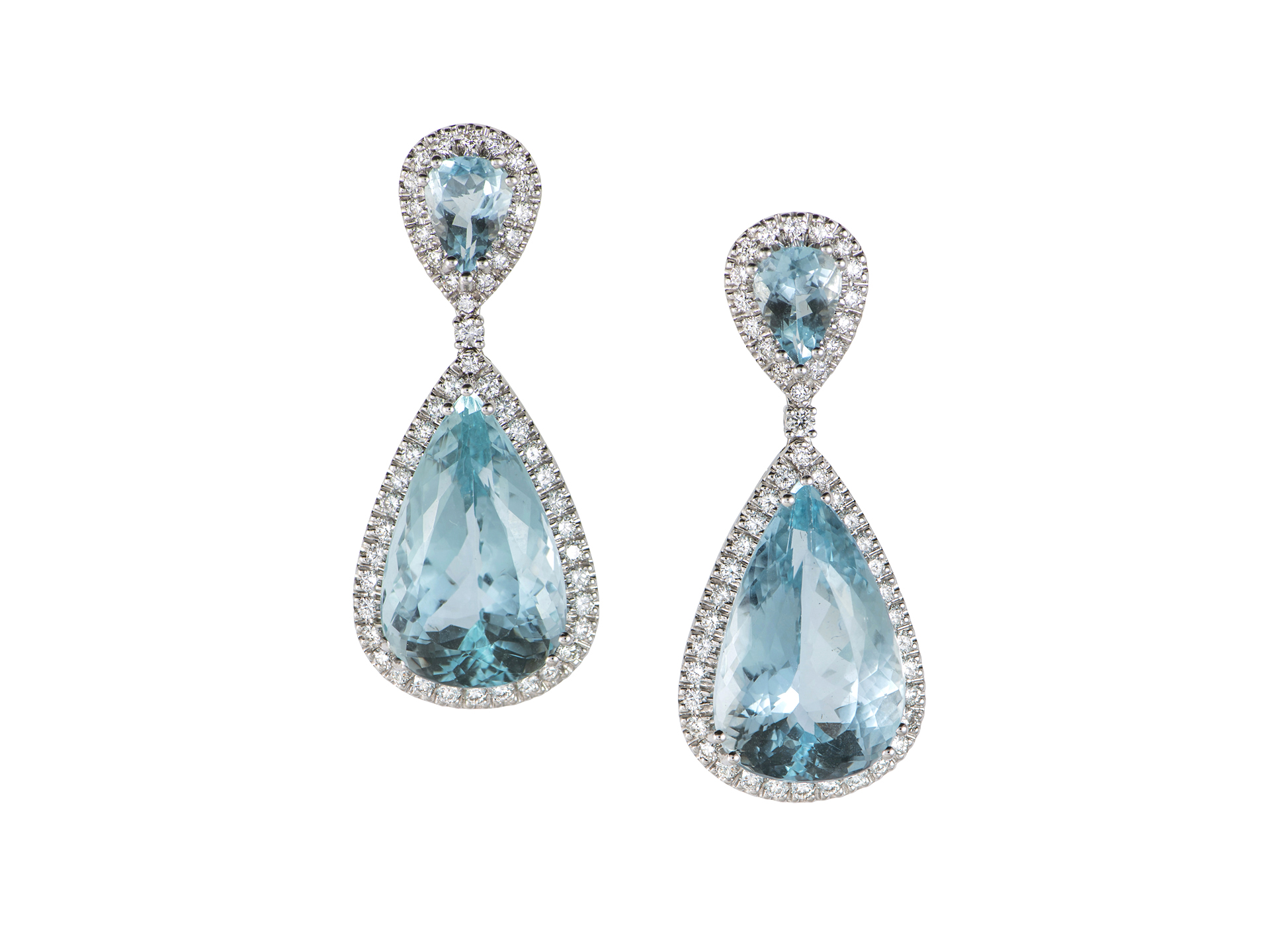 Pendant earrings with four aquamarine drops at the earlobe (ct. 25,79), in white gold with full diamond setting (ct. 1,60). Hand made in Italy.