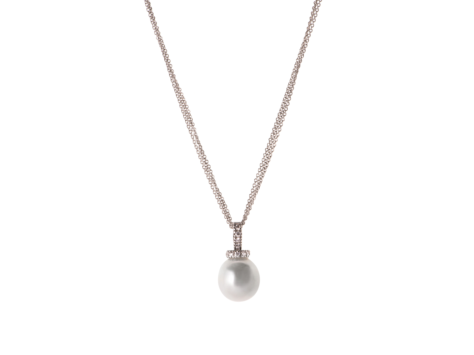 Australia white pearl pendant (mm 14,60) in white gold with diamond (ct. 0,38) and white gold multi chain. Available also with black Tahiti pearl. Hand made in Italy.