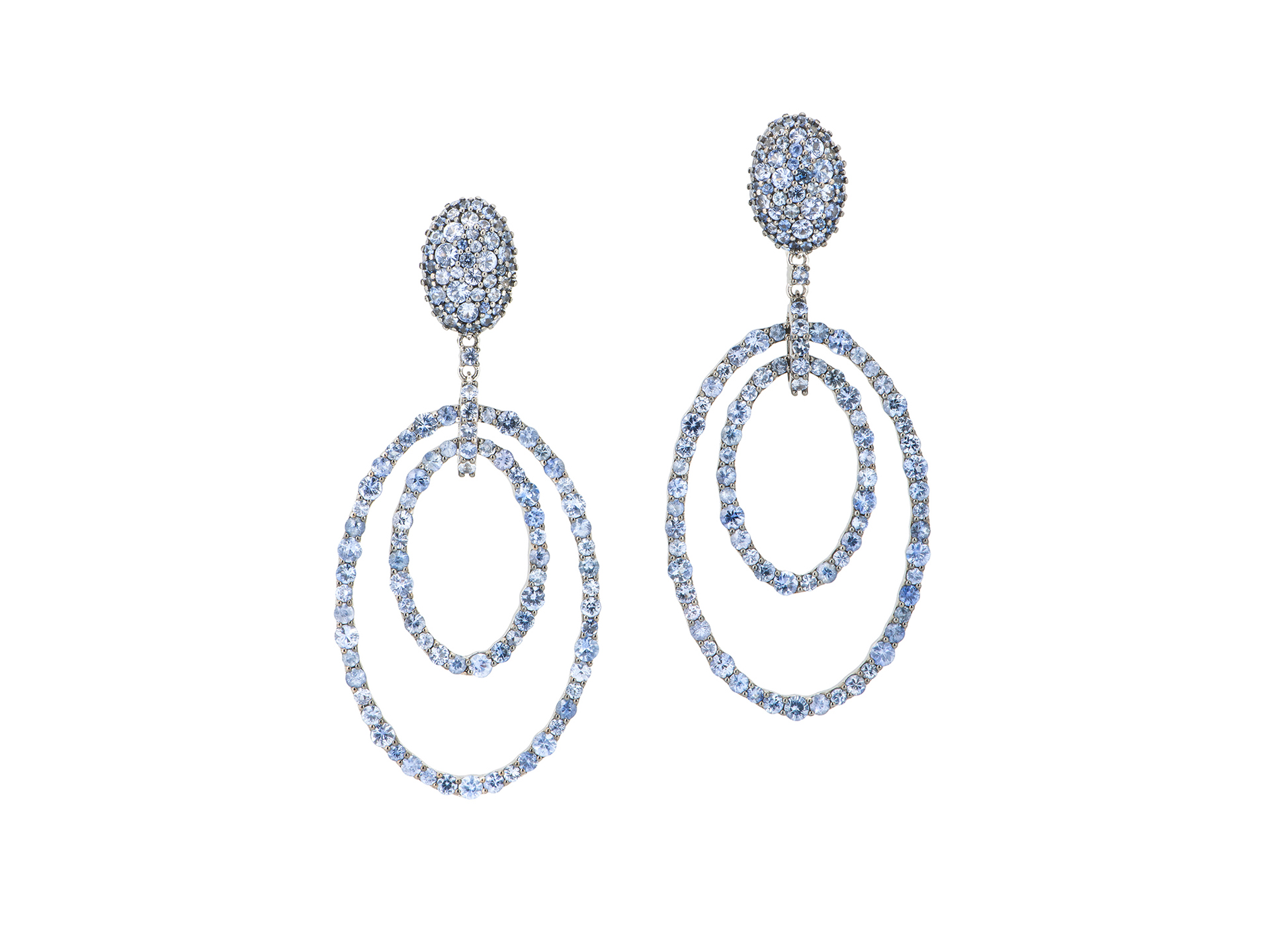 White gold pendant earrings with two fully movable elliptical elements, enlightened by light blue sapphire setting (ct. 10,00). Hausmann & Co. 1794 Collection. Hand made in Italy.