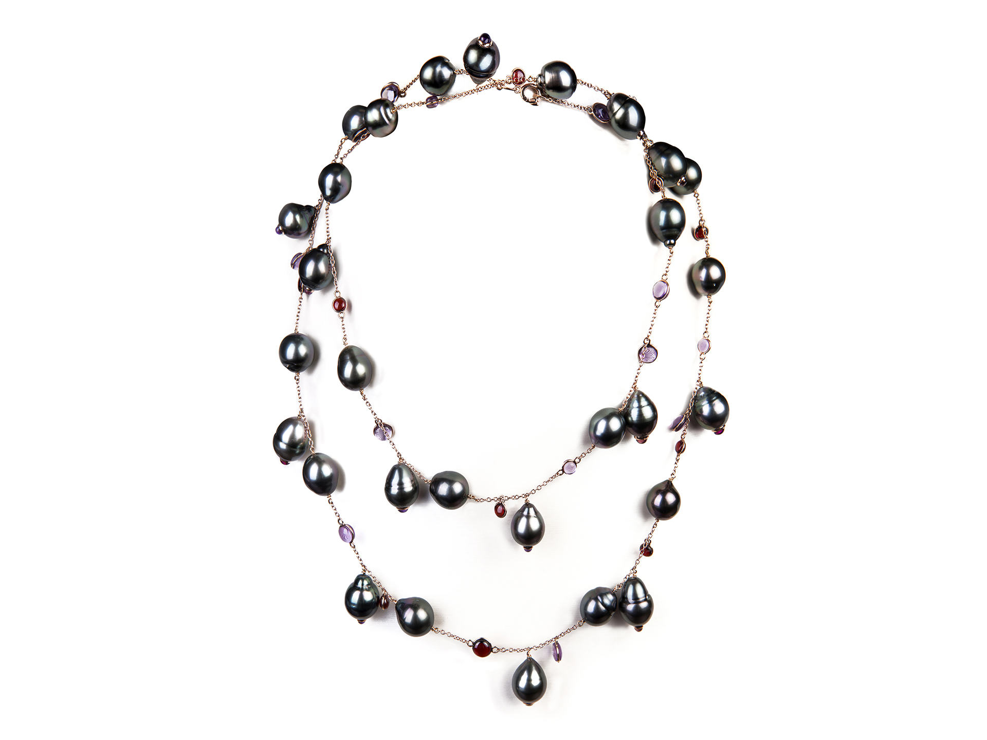 Long necklace in yellow gold with Tahiti baroque pearls and pink tourmaline (ct. 1,65), amethist (ct. 17,65) and granet (ct. 14,15) cabochons.