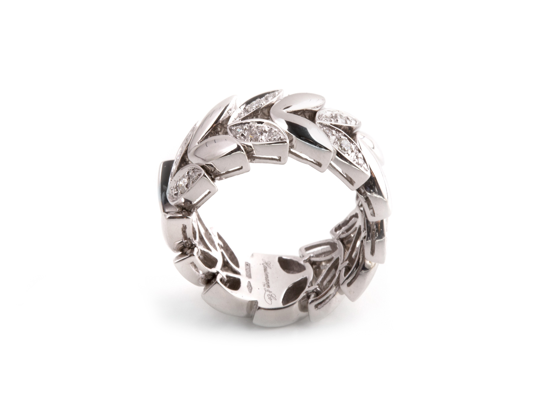 "Spiga" model. Soft band ring in white gold with diamonds (ct. 0.40) reproducing laurel leaves. Hand made in Italy.