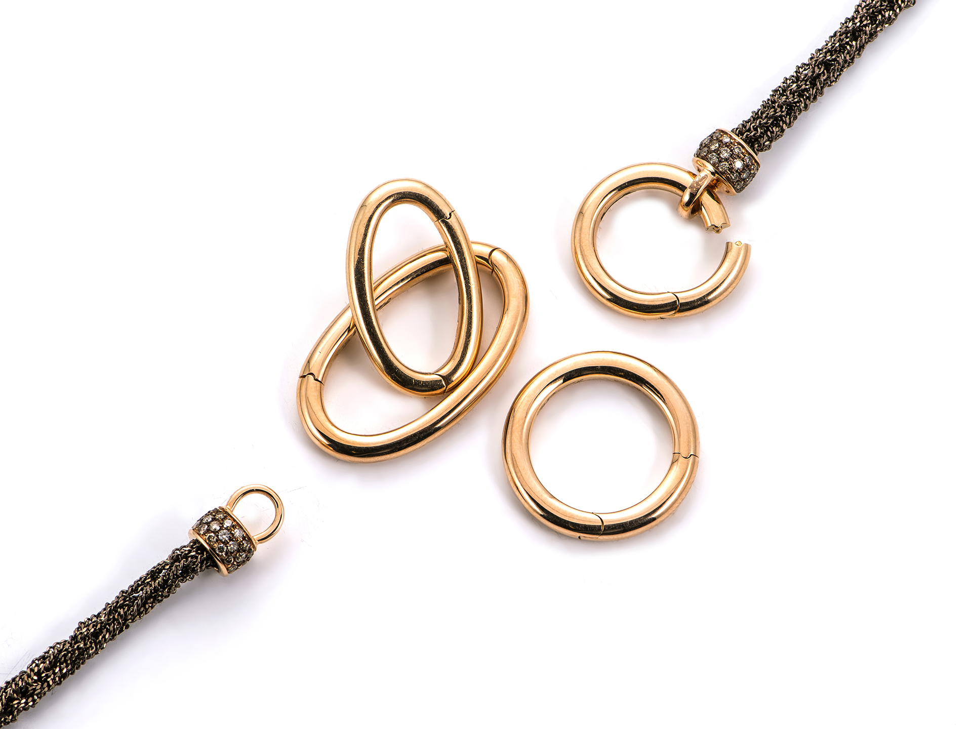 Necklace set of closures, round and oval shaped, in rose gold.  Closures are available in different sizes, shapes and precious stones, and can be mixed freely. Here presented with "Fil rouge" silver necklace with rose gold and brown diamonds.