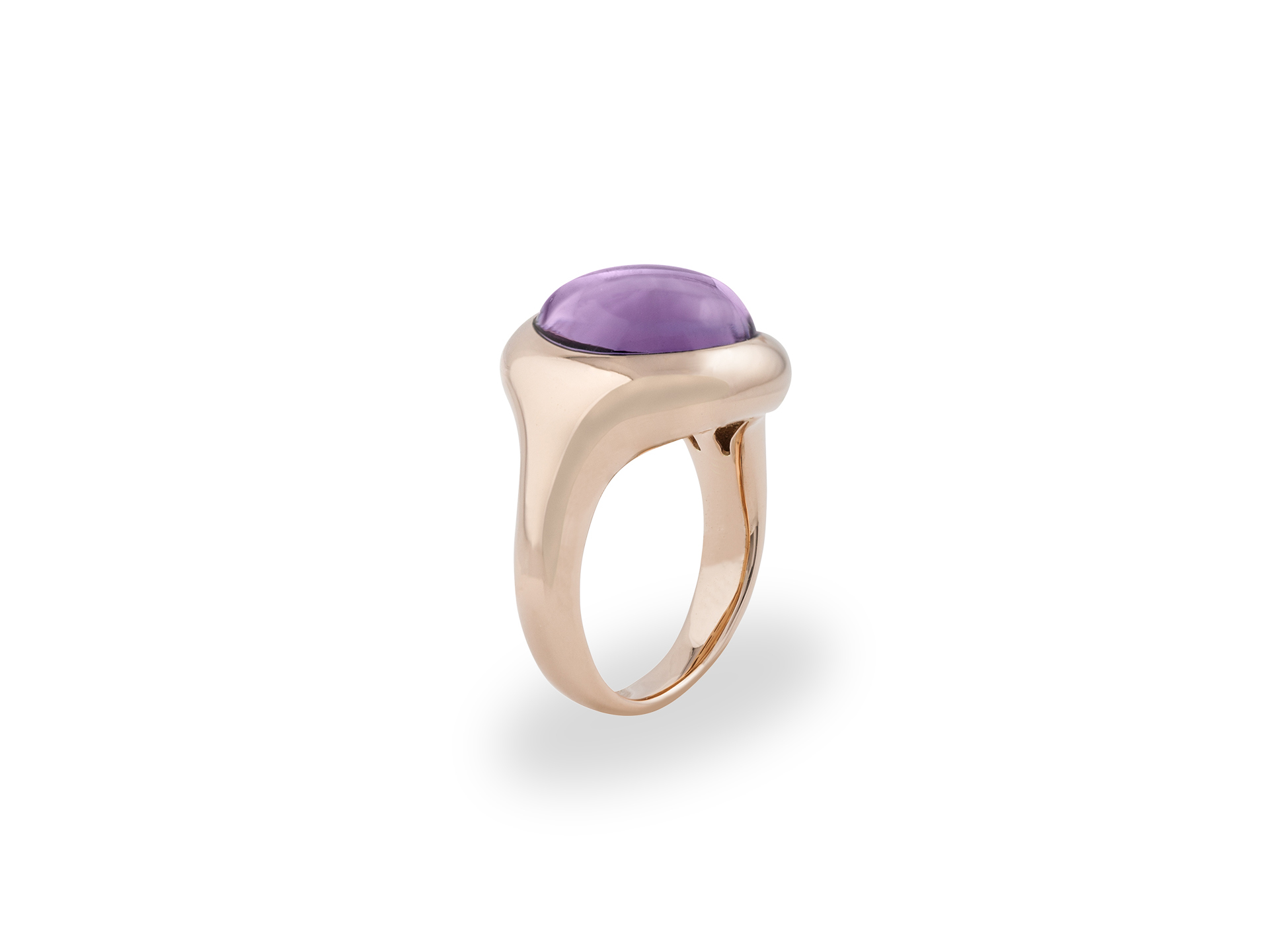 Rose gold ring with large central round cut cabochon of amethyst. Parure available with necklace and earrings. Plenilunio Collection by Hausmann & Co. Hand made in Italy.