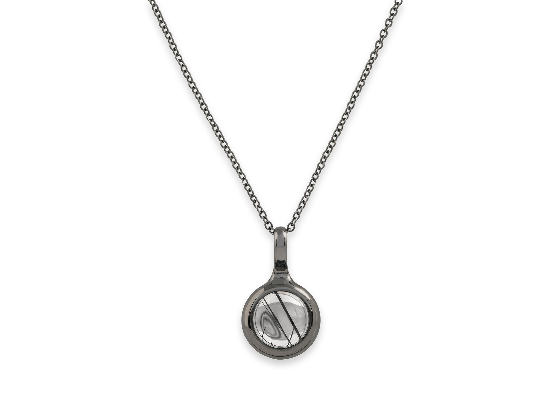 Black gold necklace with large central round cut cabochon of tourmilated quartz. Tourmilated quartz is a natural clear or white quartz which has pieces of black Tourmaline within it. Parure available with ring and earrings. Plenilunio Collection by Hausmann & Co. Hand made in Italy.