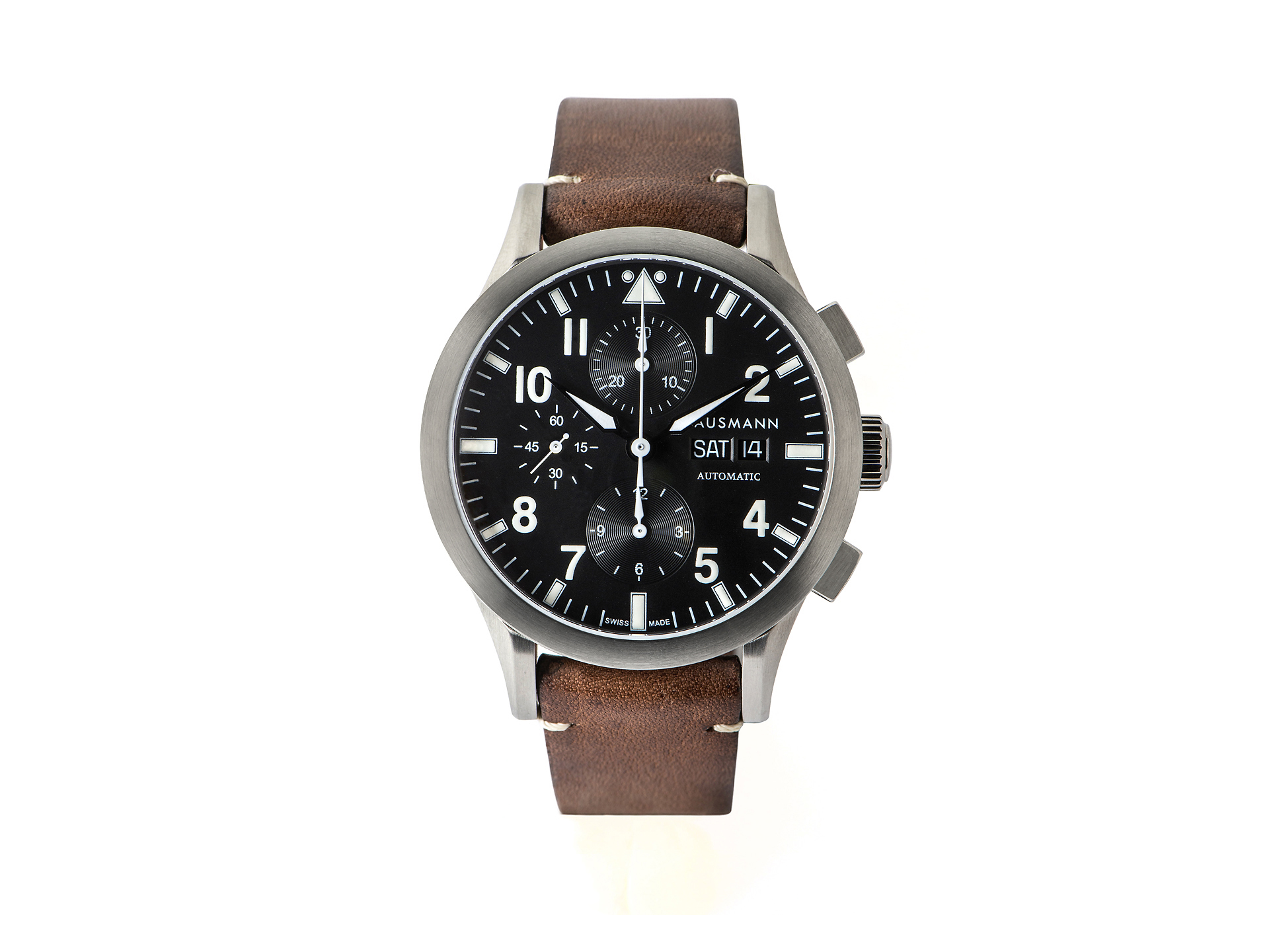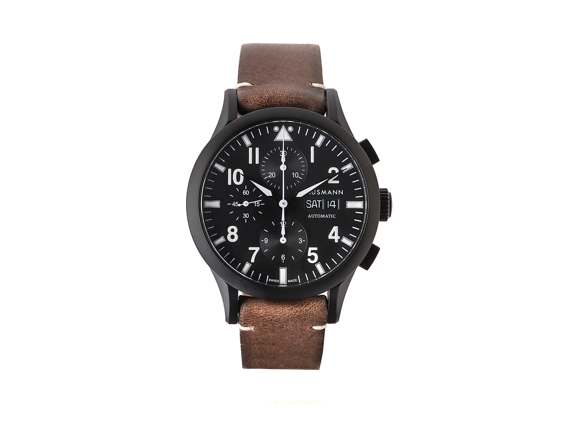 Aviator chronograph by Hausmann & Co. with black stainless steel case, diameter 42mm. Sapphire glass.