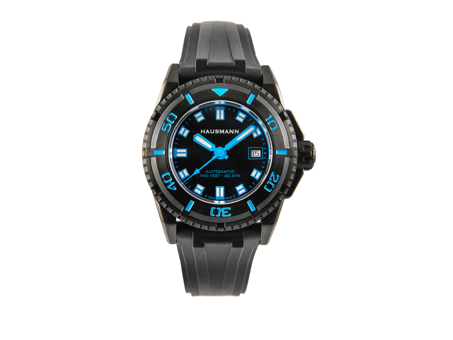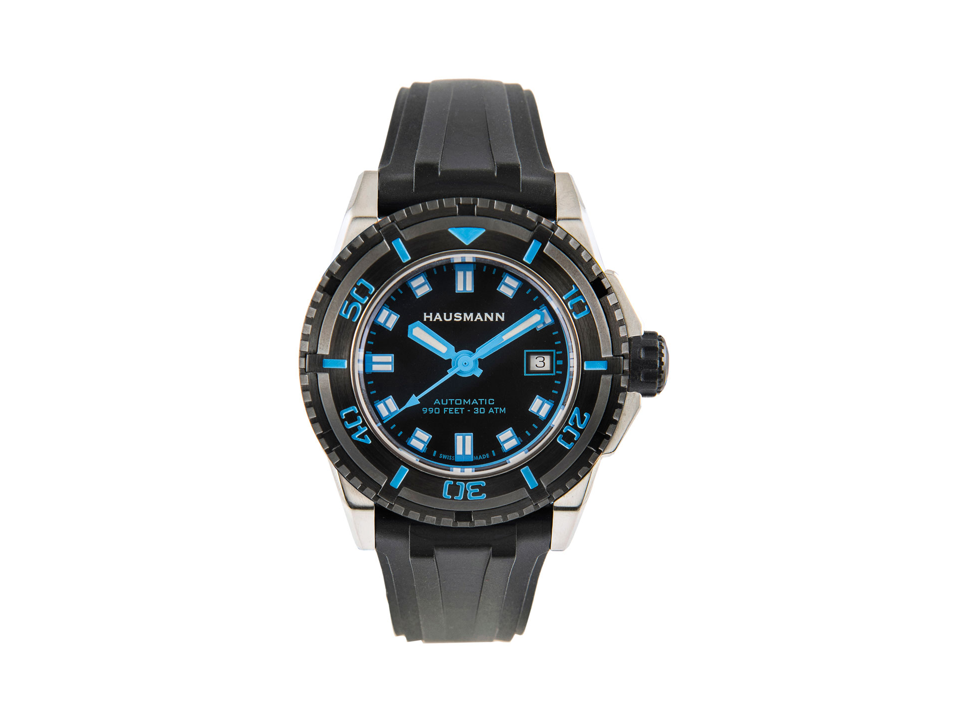 Waterproof to 300 meters (30 ATM); screw-down crown, rubber-coated.