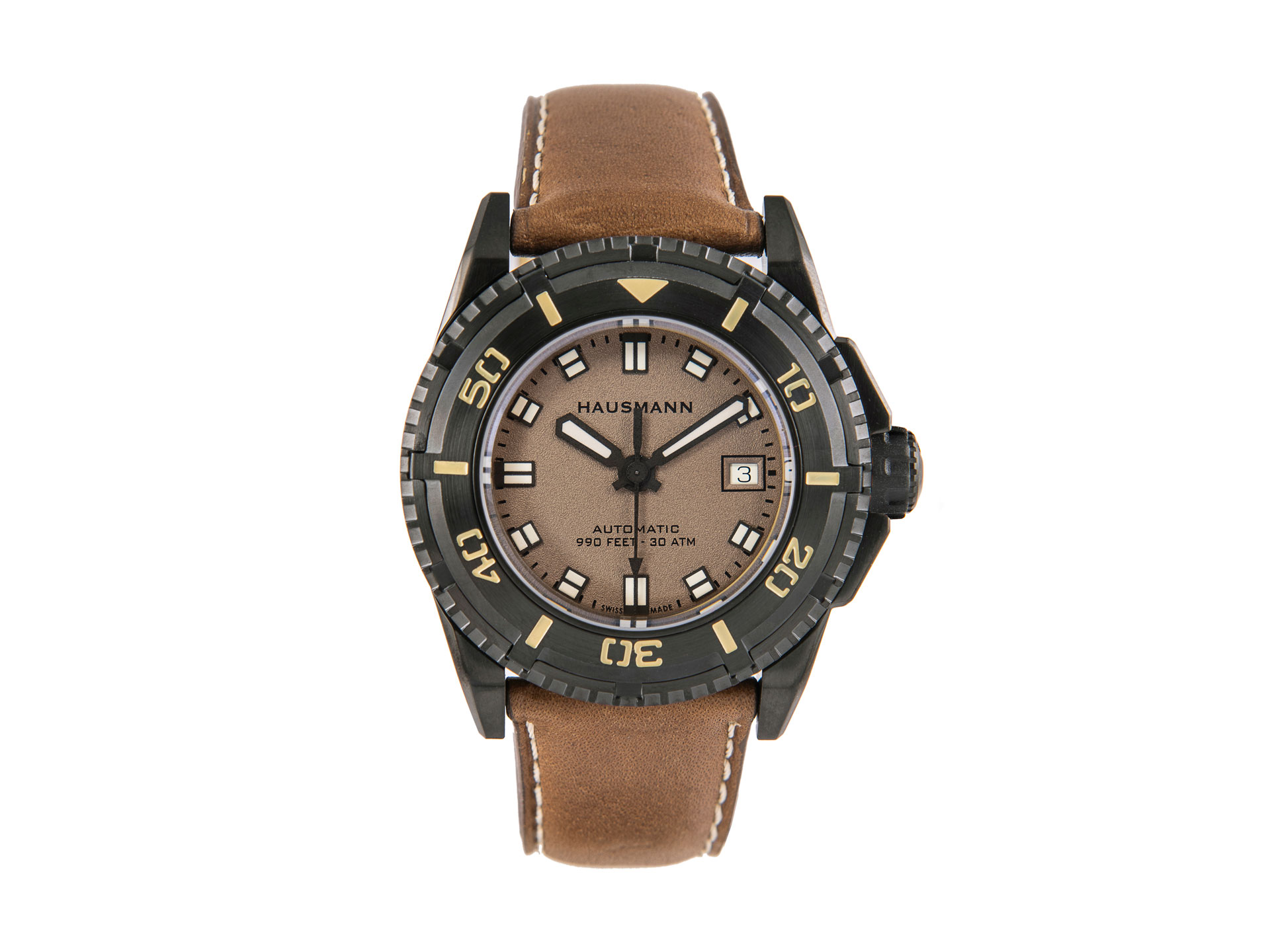 Diver watch by Hausmann & Co. in stainless steel with tobacco dial, matt black case and rotating bezel.