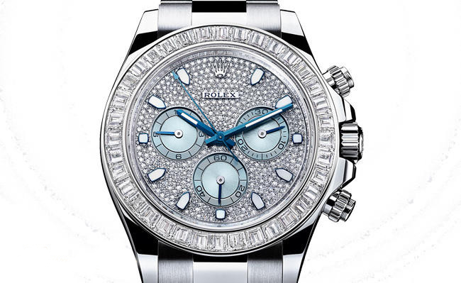 From 2013 the ceramic bezel is applied also to the first platinum Daytona, with the reference number 116506. The platinum comes in order to celebrate an important jubilee: the 50th anniversary from the introduction of the first Daytona, back at the beginning of our history. It is also the first time for an Oyster bracelet in platinum, never made before at Rolex, where the platinum was only used on President bracelets. The unusual, but very elegant, hazelnut color of the bezel exalts the ice blue color of the dial, the typical color for platinum at Rolex. On 2014, the platinum Daytona was enriched of a version with a diamond bezel, available also with precious dials.