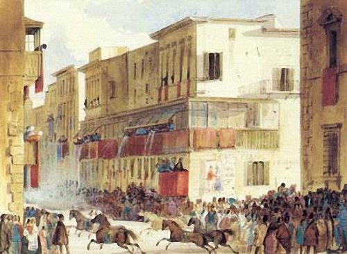 La Corsa dei Berberi sotto a Palazzo Fiano, in un dipinto di Ippolito Caffi