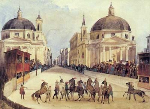 “La Mossa”, ovvero la partenza dei cavalli senza destriero a Piazza del Popolo, in un dipinto di Ippolito Caffi.