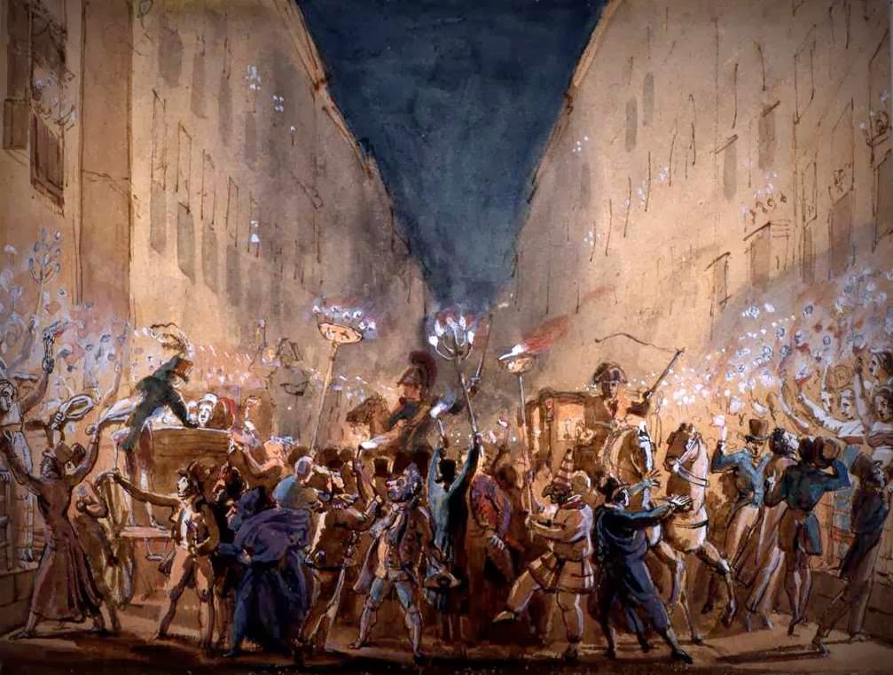 Una rappresentazione della festa dei Moccoletti, il Martedì Grasso del Carnevale Romano, in via del Corso. Jean Louis Baptiste Thomas, acquerello e tempera, 1817.