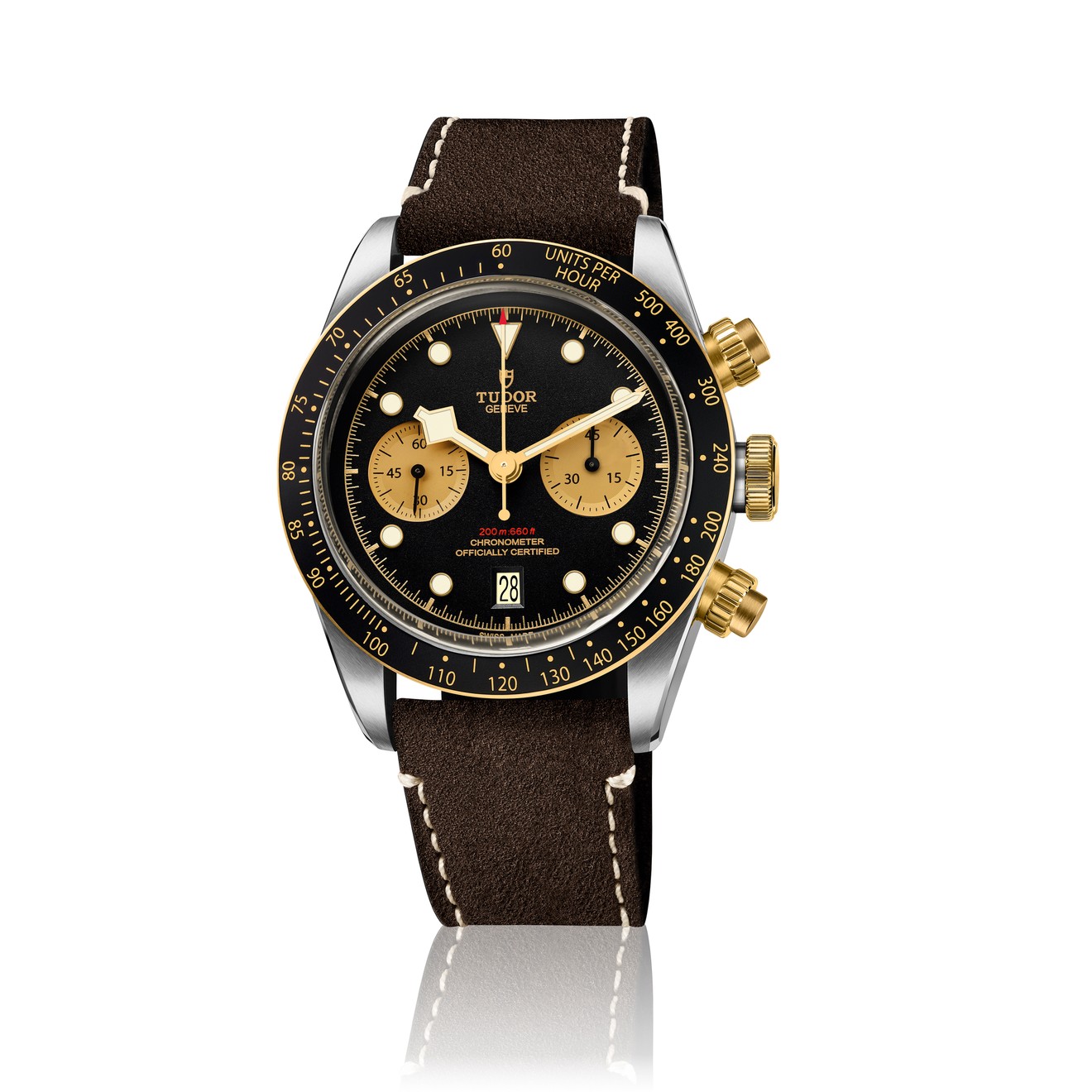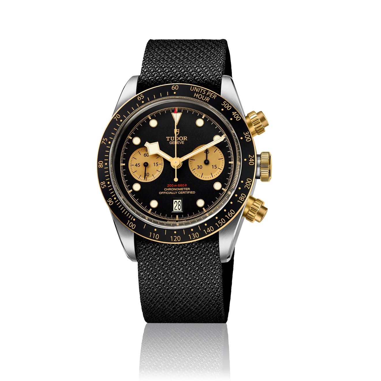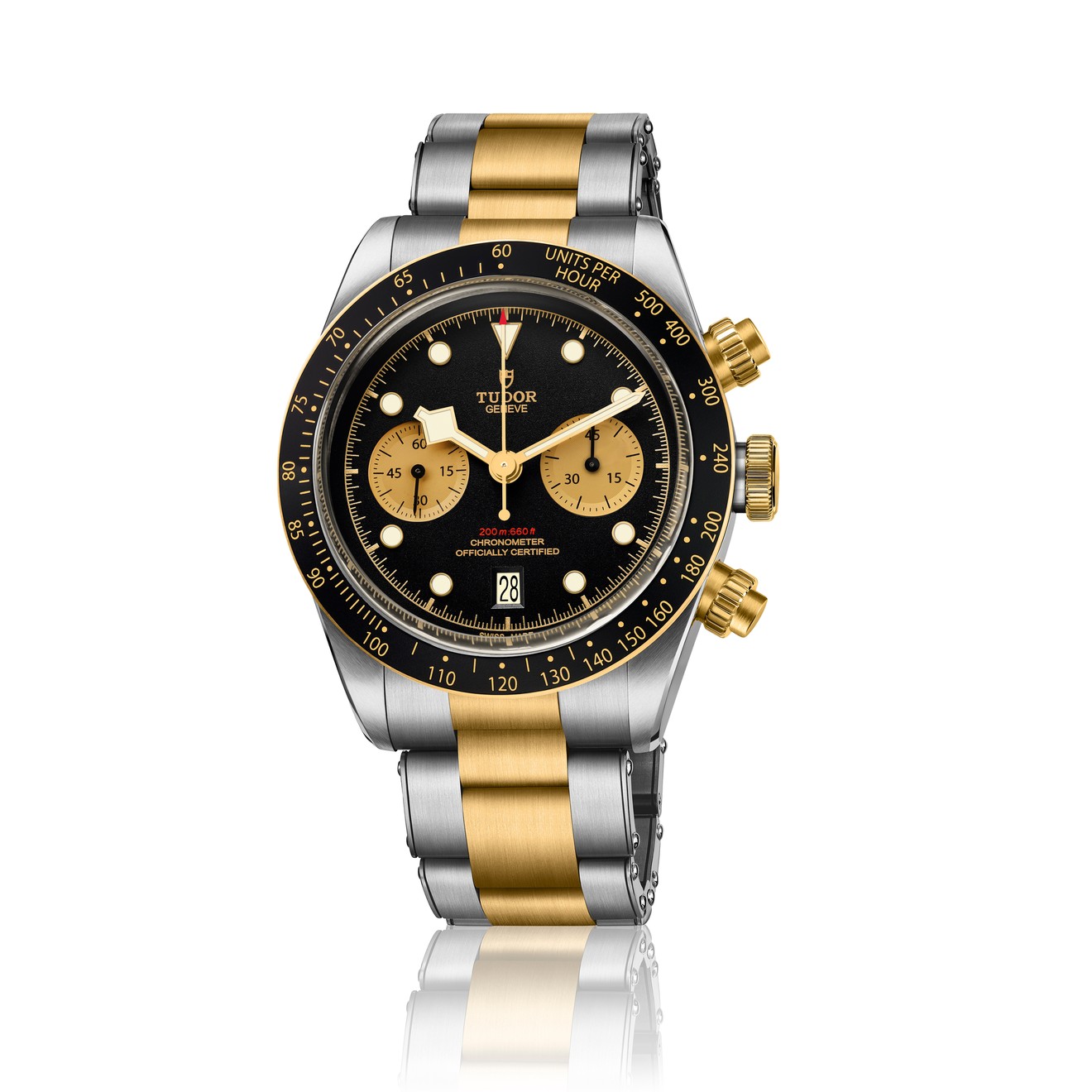 Though staying true with the Black Bay look, this new model develops a new style: the famous “Snowflake” hands, a distinctive feature of the Brand since 1969, have been upgraded with a gold version that provides an excellent contrast with the domed black dial, ensuring excellent readability. The counters are concave and champagne coloured. The calendar is located at 6 pm, as is traditional with Tudor chronographs. The 41 mm steel case is a distinctive feature of the Black Bay, and it sports yellow gold screw-down pushers reminiscent of the first generation of Tudor chronographs. The yellow gold bezel with its matt black anodised aluminium disk and tachymetric scale rounds off this brand new chronograph.