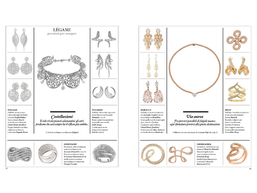 Sempre “Io Donna” associa i gioielli all’amore, nello speciale per i matrimoni “Wedding Book”. Le proposte in oro bianco e in oro rosa includono anche le collezioni più classiche di Hausmann & Co. Dalla collezione 1794, un anello a fascia in oro bianco con diamanti. Dalla collezione Infinito, dedicata all’amore e all’indeterminatezza del tempo, un anello in oro rosa modello “Doppio Infinito” con diamanti brown.