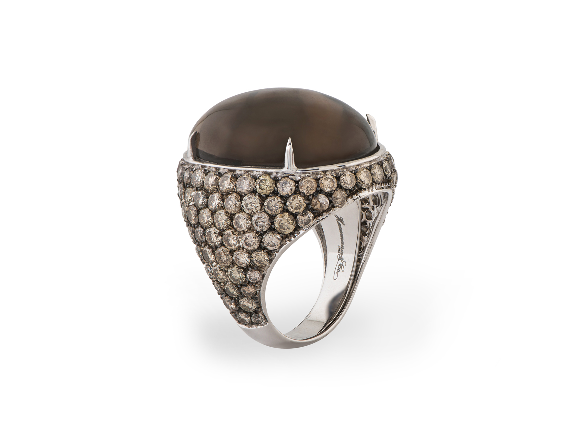 Anello con grande cabochon di quarzo fumé e diamanti grigi