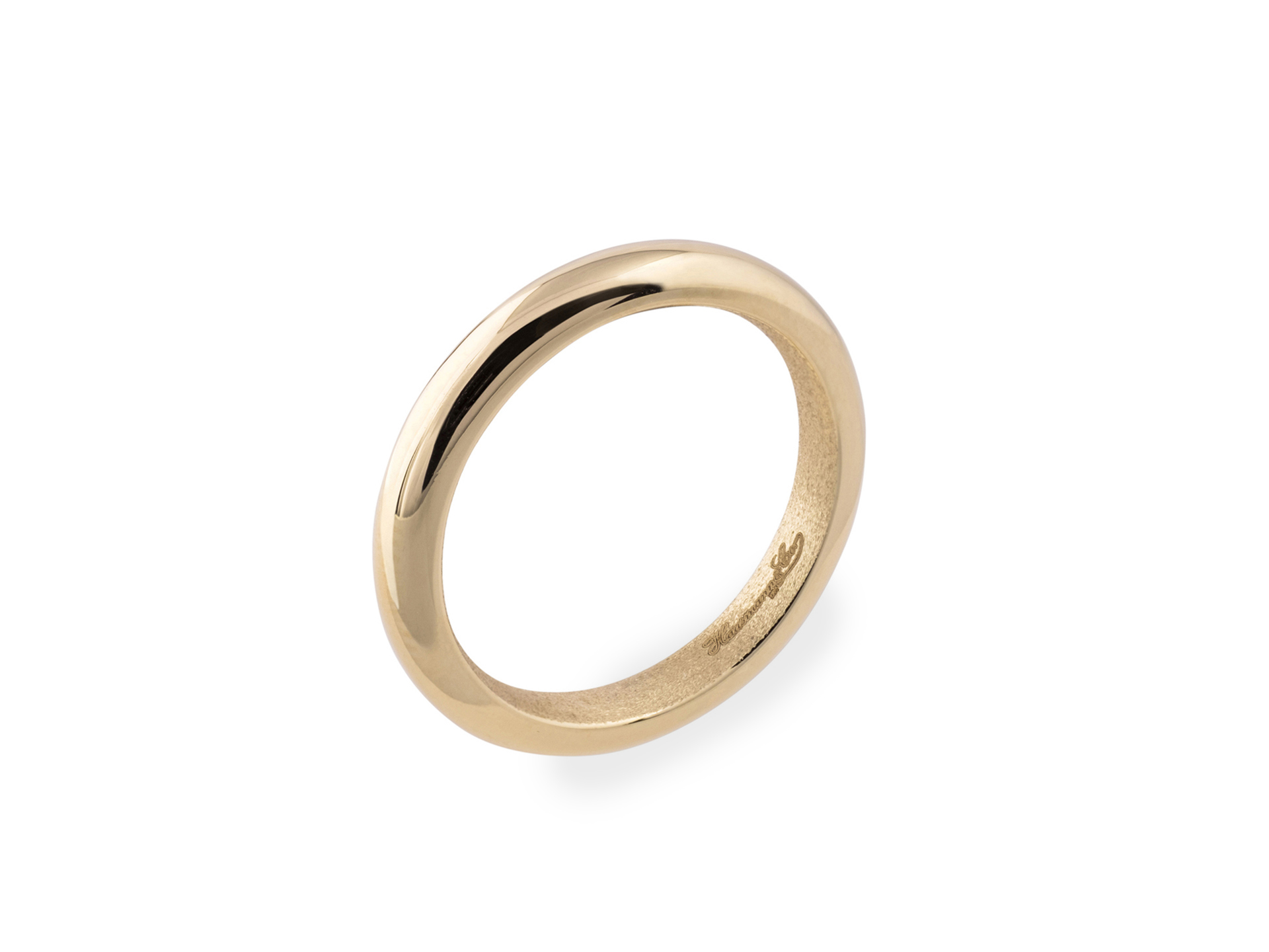 Fede nuziale in oro giallo, modello italiano con sezione quasi rotonda, per chi gradisce la forma tradizionale dell'anello nuziale. Un design apparentemente semplice custodisce il segreto di una elegante texture interna satinata e la possibilità di un bassorilievo con le lettere del nome degli sposi all'interno della fede nuziale, in alternativa all'incisione. Le fedi Hausmann & Co. Collezione Kilikion. Pur nella tradizione, il piacere della scelta.