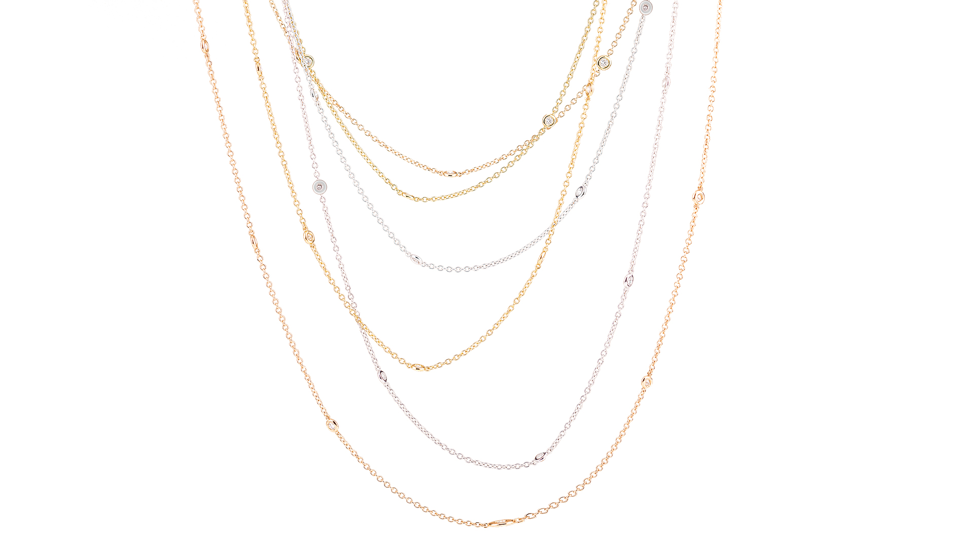 Collana composta da catene in oro giallo, rosa e bianco, con sequenza di diamanti taglio brillante.