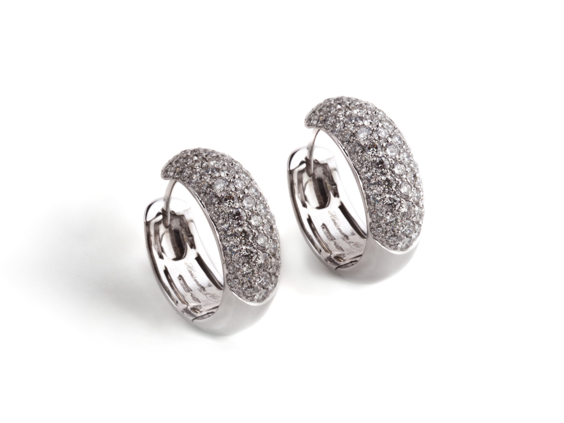 Orecchini a cerchio bombato in oro bianco con pavé di diamanti sul lato anteriore (ct. 4). Disponibili in formato piccolo e grande.
