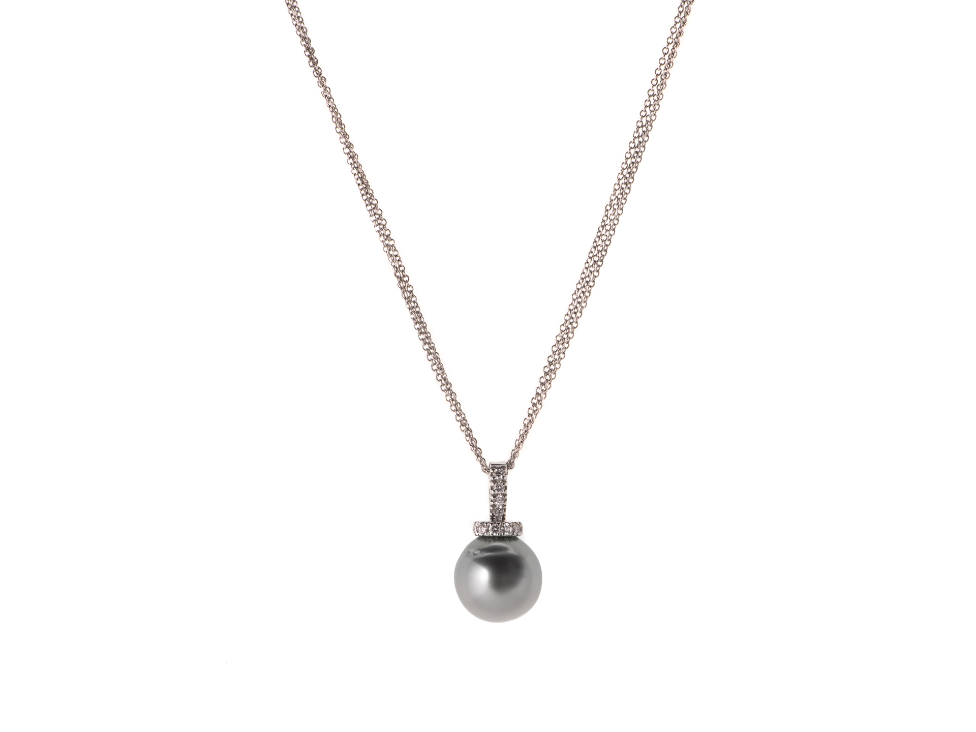 Ciondolo con perla nera di Tahiti (mm 12), con montatura in oro bianco e diamanti (ct. 0,38) e catenina in oro bianco multifilo. Disponibile anche con perla bianca australiana.