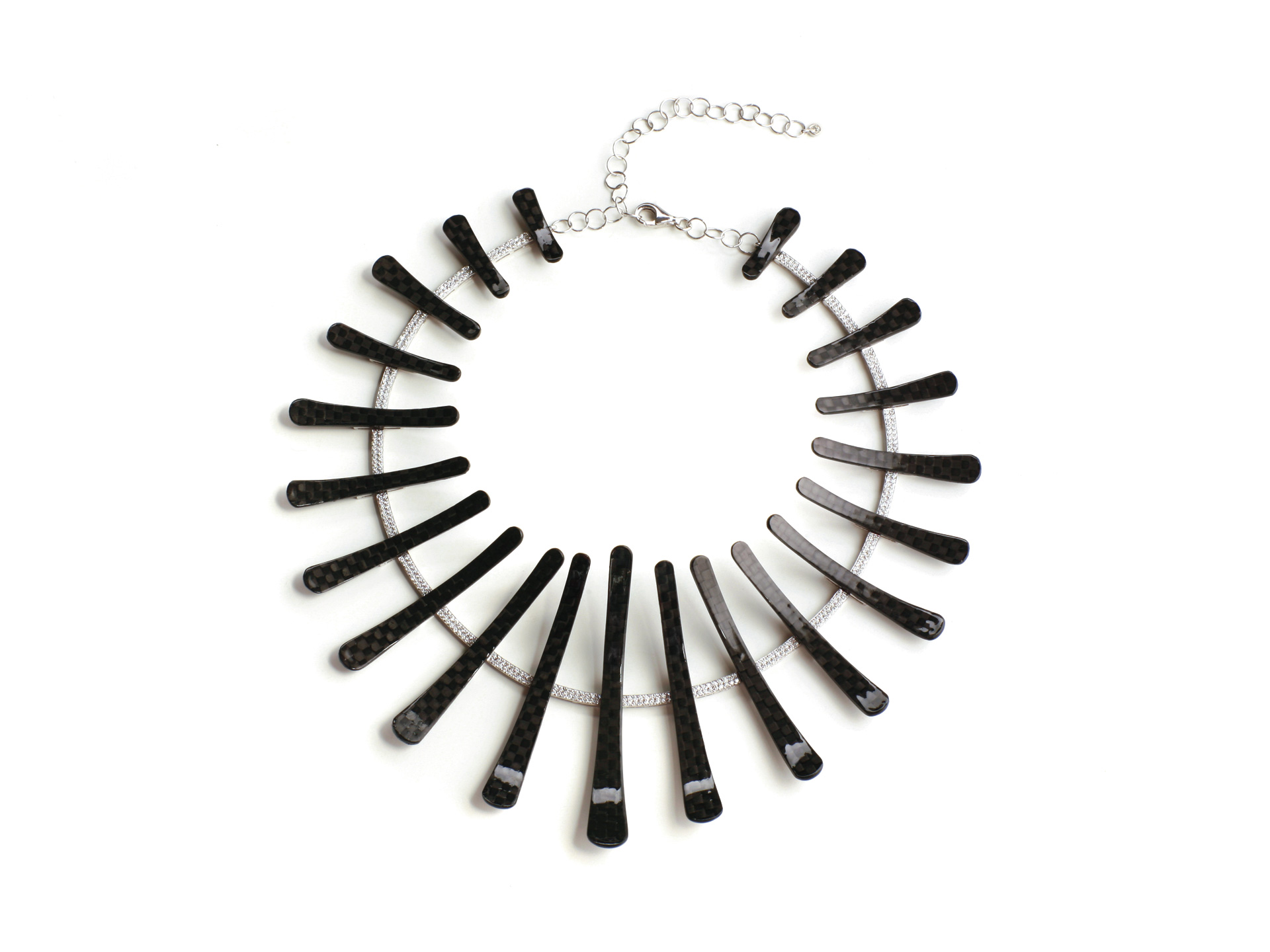 Collier in oro bianco e diamanti (ct. 2,22) con inserti in fibra di carbonio.