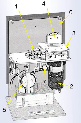 I componenti dell’orologio sono montati su una platina verticale dietro il quadrante e su una orizzontale che supporta il movimento, come mostrato nello schema alla pagina successiva. Il movimento, indicato con il numero “1”, è il calibro 17”’-150, utilizzato per orologi da tasca: 17 linee (38.25 mm) di diametro, 2.90 mm di spessore, 18.000 alternanze per ora, 18 rubini. Il “2” indica il motore elettrico alimentato dall’energia proveniente dall’accumulatore (“5”), il “3” i ruotismi di demoltiplicazione necessari per adattare la potenza di carica del motore alle esigenze del meccanismo, il “4” lo switch. Il “6” indica il retro del quadrante ed il “7” la corona per la messa all’ora.